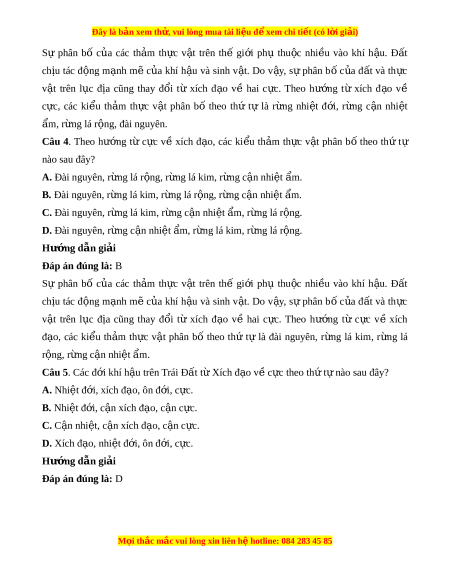 Đây là bản xem th , vu ử i lòng mua tài li u ệ đ xe ể m chi ti t (c ế ó l i ờ gi i ả ) Khí h u ậ đư c ợ hình thành do tác đ ng ộ c a ủ b c ứ x ạ m t ặ tr i ờ , hoàn l u ư khí quy n ể và bề m t ặ đ m ệ . Các đ i ớ khí h u ậ trên Trái Đ t ấ t ừ Xích đ o ạ v ề c c ự theo th ứ t ự là xích đ o, ạ nhiệt đ i ớ , ôn đ i ớ và c c. ự Câu 6. Nh n ậ đ nh nào s ị