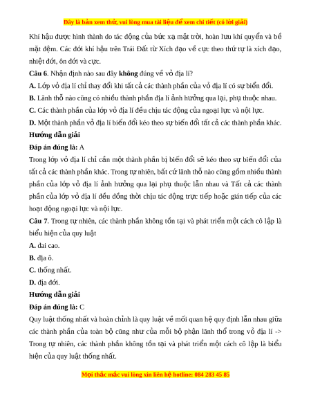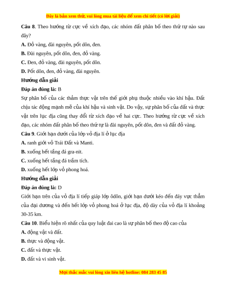 D. Pốt dôn, đen, đ vàng, đài ỏ nguyên. Hư ng d ớ ẫn gi i ả Đáp án đúng là: B Sự phân bố c a ủ các th m ả th c ự v t ậ trên thế gi i ớ phụ thu c ộ nhi u ề vào khí h u. ậ Đ t ấ chịu tác đ ng ộ m nh ạ mẽ c a ủ khí h u ậ và sinh v t ậ . Do v y ậ , s ự phân b ố c a ủ đ t ấ và th c ự v t ậ trên l c ụ đ a ị cũng thay đ i ổ từ xích đ o ạ về hai c c. ự Theo hư ng ớ từ c c ự về xích đ o, ạ các nhóm đ t ấ phân b t ố heo th t ứ l ự à đài nguyên, p t ố dôn, đen và đ t ấ đ vàng. ỏ Câu 9. Gi i ớ h n ạ dư i ớ c a ủ l p v ớ đ ỏ a l ị í l ở c đ ụ a ị A. ranh gi i ớ v ỏ Trái Đ t ấ và Manti. B. xuống h t ế tầng đá gra-nit. C. xuống h t ế tầng đá trầm tích. D. xuống h t ế l p v ớ phong hoá. ỏ Hư ng d ớ ẫn gi i ả Đáp án đúng là: D Gi i ớ h n ạ trên c a ủ vỏ đ a ị lí ti p ế giáp l p ớ ôdôn, gi i ớ h n ạ dư i ớ kéo đ n ế đáy v c ự th m ẳ c a ủ đ i ạ dư ng ơ và đ n ế h t ế l p ớ vỏ phong hoá ở l c ụ đ a, ị độ dày c a ủ vỏ đ a ị lí kho ng ả 30-35 km. Câu 10. Bi u ể hi n r ệ õ nhất c a quy l ủ u t