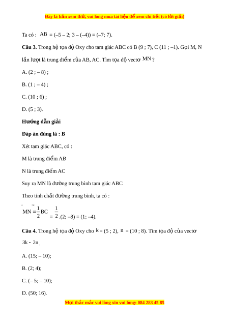 Đáp án đúng là : B Xét tam giác ABC, có : M là trung đi m ể AB N là trung đi m ể AC Suy ra MN là đư ng t ờ rung bình tam giác ABC Theo tính ch t ấ đư ng t ờ rung bình, ta có : 1 1 MN BC 2 = 2 .(2; –8) = (1; –4). Câu 4. Trong hệ t a ọ đ O