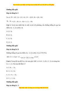 Câu 5. Vectơ nào dư i ớ đây là m t ộ vectơ chỉ phư ng ơ c a ủ đư ng ờ th ng ẳ đi qua hai đi m ể A(– 3; 2) và B(1; 4). A. (1; 3); B. (2; 1); C. (1; 3); D. (3; 1). Hư ng d ớ ẫn gi i ả Đáp án đúng là: B Đư ng ờ th ng đi ẳ qua hai đi m