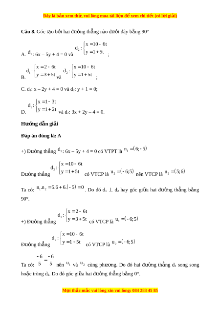Câu 8. Góc t o b i hai đ ng th ng ạ ở ườ ẳ nào d i đây b ng 90°ướ ằ