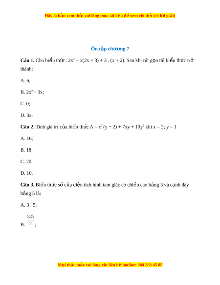 ứ 2x2 − x(2x + 3) + 3 . (x + 2). Sau khi rút g n t ọ hì bi u t ể h c t ứ r ở thành: A. 6; B. 2x2 − 3x; C. 0; D. 3x. Câu 2. Tính giá tr c ị a bi ủ u t ể h c