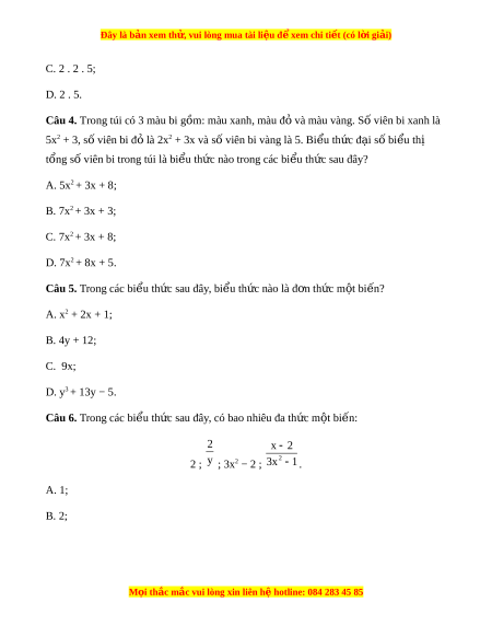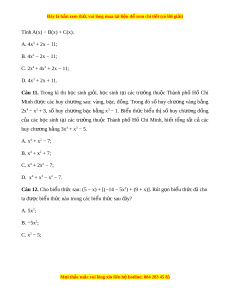 tổng số viên bi trong túi là bi u t ể h c ứ nào trong các bi u t ể h c s ứ au đây? A. 5x2 + 3x + 8; B. 7x2 + 3x + 3; C. 7x2 + 3x + 8; D. 7x2 + 8x + 5. Câu 5. Trong các bi u ể th c ứ sau đây, bi u ể th c nào l ứ à đ n t ơ h c ứ m t ộ bi n? ế A. x2 + 2x + 1; B. 4y + 12; C. 9x; D. y3 + 13y − 5. Câu 6. Trong các bi u ể th c