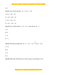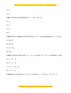 ứ sau: y − 3 +5y2 − 6y5 + y4. A. 1; B. 2; C. 4; D. 5. Câu 8. T p các nghi ậ ệm c a đa ủ th c B ứ (x) = 3x2 − 12 trong t p ậ h p {0; ợ 2; −2; 3} là: A. {0; 2}; B. {0; 3}; C. {2; −2}; D. {2}.