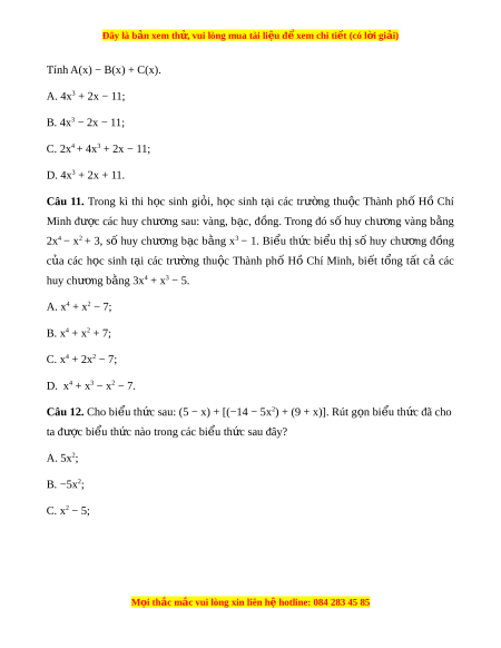 Đây là bản xem th , vu ử i lòng mua tài li u ệ đ xe ể m chi ti t (c ế ó l i ờ gi i ả ) Tính A(x) − B(x) + C(x). A. 4x3 + 2x − 11; B. 4x3 − 2x − 11; C. 2x4 + 4x3 + 2x − 11; D. 4x3 + 2x + 11.