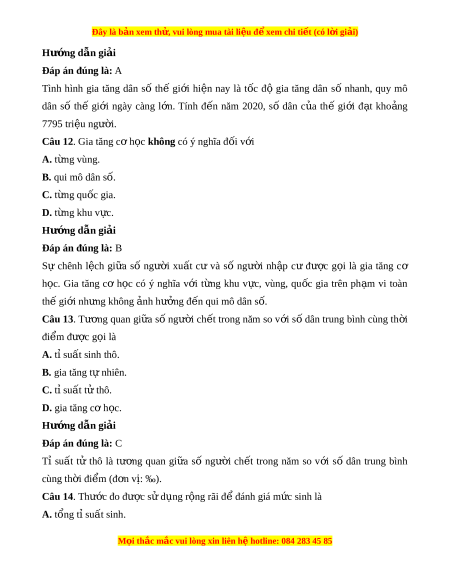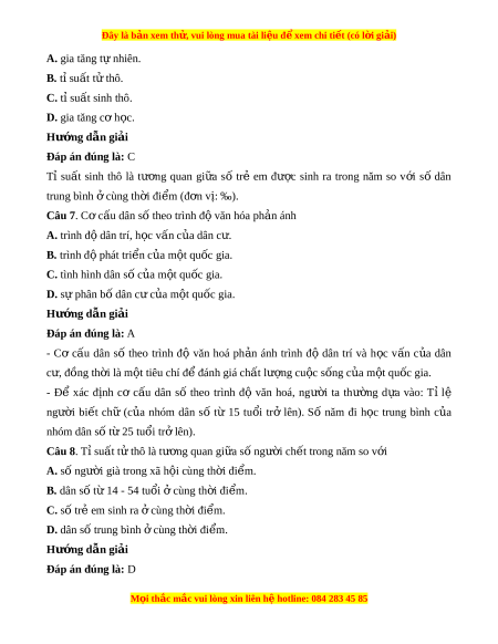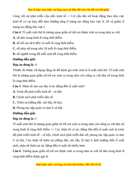 C. tỉ suất sinh thô. D. gia tăng cơ h c. ọ Hư ng d ớ ẫn gi i ả Đáp án đúng là: C Tỉ su t ấ sinh thô là tư ng ơ quan gi a ữ số trẻ em đư c ợ sinh ra trong năm so v i ớ số dân trung bình cùng t ở h i ờ đi m ể (đ n v ơ : ị ‰).