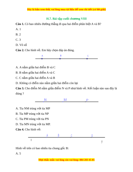 Câu 1. Có bao nhiêu đư ng t ờ h ng ẳ đi qua hai đi m ể phân bi t ệ A và B? A. 1 B. 2 C. 3 D. Vô số Câu 2. Cho hình v . E ẽ m hãy ch n đáp ọ án đúng. A. A n m ằ gi a hai ữ đi m ể B và C B. B n m ằ gi a hai ữ đi m ể A và C C. C n m ằ gi a hai ữ đi m ể A và B D. Không có đi m ể nào n m ằ gi a hai ữ đi m ể còn l i ạ Câu 3. Cho đi m ể M n m ằ gi a đi ữ m ể N và P nh hì ư nh v . K ẽ t ế lu n nào s ậ au đây là đúng ? A. Tia NM trùng v i ớ tia MP B. Tia MP trùng v i ớ tia NP C. Tia PM trùng v i ớ tia PN D. Tia MN trùng v i ớ tia MP. Câu 4. Cho hình v : ẽ Hình v t