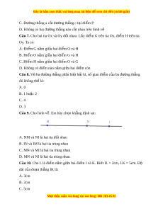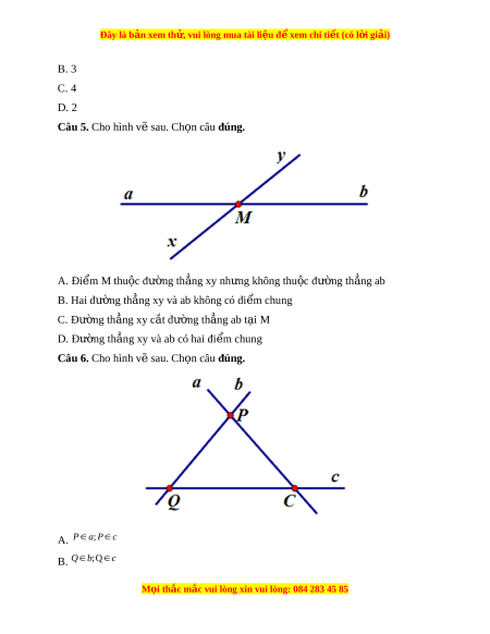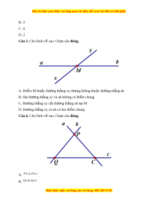 Đây là bản xem th , vu ử i lòng mua tài li u ệ đ xe ể m chi ti t (c ế ó l i ờ gi i ả ) B. 3 C. 4 D. 2 Câu 5. Cho hình v s ẽ au. Ch n ọ câu đúng. A. Đi m ể M thu c đ ộ ư ng ờ th ng xy nh ẳ ng không t ư hu c ộ đư ng t ờ h ng ab ẳ B. Hai đư ng t ờ h ng ẳ xy và ab không có đi m ể chung C. Đư ng t ờ h ng ẳ xy c t ắ đư ng ờ th ng ab t ẳ i ạ M D. Đư ng ờ th ng xy và ab ẳ có hai đi m ể chung Câu 6. Cho hình v s ẽ au. Ch n ọ câu đúng.