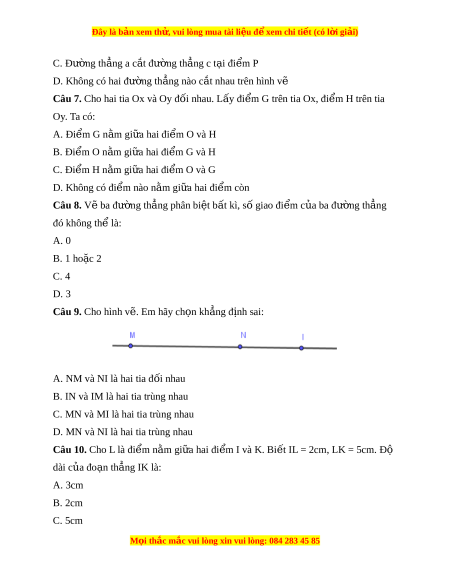 Câu 7. Cho hai tia Ox và Oy đ i ố nhau. L y đi ấ m ể G trên tia Ox, đi m ể H trên tia Oy. Ta có: A. Đi m ể G n m ằ gi a hai ữ đi m ể O và H B. Đi m ể O n m ằ gi a ữ hai đi m ể G và H C. Đi m ể H n m ằ gi a ữ hai đi m ể O và G D. Không có đi m ể nào n m ằ gi a hai ữ đi m ể còn Câu 8. Vẽ ba đư ng ờ th ng phân bi ẳ t ệ b t ấ kì, s gi ố ao đi m ể c a ba ủ đư ng t ờ h ng ẳ đó không th l ể à: A. 0 B. 1 ho c ặ 2 C. 4 D. 3 Câu 9. Cho hình v . E ẽ m hãy ch n kh ọ ng ẳ đ nh s ị ai: A. NM và NI là hai tia đ i ố nhau