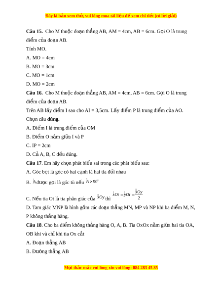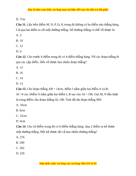 ể M, N, P, Q, K trong đó không có ba đi m ể nào th ng hàng. ẳ Cứ qua hai đi m ể ta v m ẽ t ộ đư ng ờ th ng. ẳ S đ ố ư ng ờ th ng có t ẳ h v ể đ ẽ ư c ợ là: A. 3 B. 10 C. 12 D. 4 Câu 12. Cho trư c ớ 6 đi m ể trong đó có 4 đi m ể th ng ẳ hàng. V các ẽ đo n t ạ h ng ẳ đi qua các c p ặ đi m ể . H i ỏ v đ ẽ ư c bao nhi ợ êu đo n t ạ h ng? ẳ A. 15 B. 16 C. 14 D. 13 Câu 13. Cho đo n t ạ h ng ẳ AB = 14cm, đi m ể I n m ằ gi a ữ hai đi m ể A và B; AI =4 cm. Đi m ể O n m ằ gi a ữ hai đi m ể I, B sao cho AI = OB. G i ọ M, N l n l ầ ư t ợ là trung đi m ể c a đo ủ n ạ th ng ẳ AI, OB. Tính đ dài ộ đo n t ạ h ng ẳ MN. A. 10cm B. 8cm C. 12cm D. 6cm Câu 14. Cho 24 đi m ể trong đó có 6 đi m ể th ng ẳ hàng. Qua 2 đi m ể ta k đ ẻ ư c ợ m t ộ đư ng ờ th ng. H ẳ i ỏ k đ ẻ ư c ợ t t ấ c bao nhi ả êu đư ng ờ th ng? ẳ A. 276 B. 290 C. 262 D. 226 M i ọ thắc m c