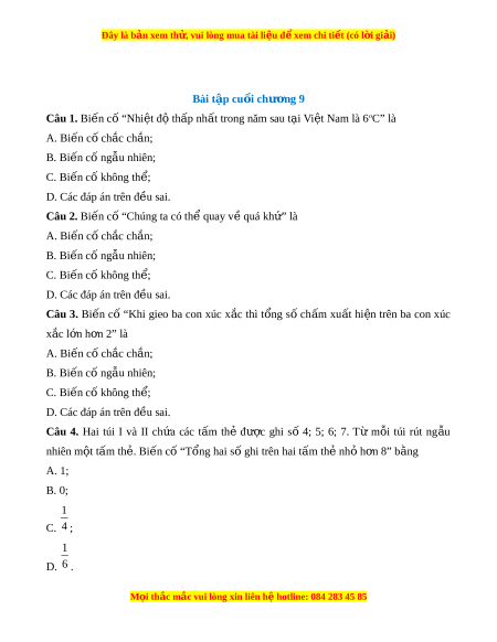 Đây là bản xem th , vu ử i lòng mua tài li u ệ đ xe ể m chi ti t (c ế ó l i ờ gi i ả ) Bài t p cu ậ i ố chư ng ơ 9 Câu 1. Bi n ế cố “Nhi t ệ đ t ộ h p nh ấ t ấ trong năm sau t i ạ Vi t ệ Nam là 6C” là A. Bi n ế cố ch c ắ ch n; ắ B. Bi n c ế ố ng u nhi ẫ ên; C. Bi n c ế ố không th ; ể D. Các đáp án trên đ u s ề ai. Câu 2. Bi n