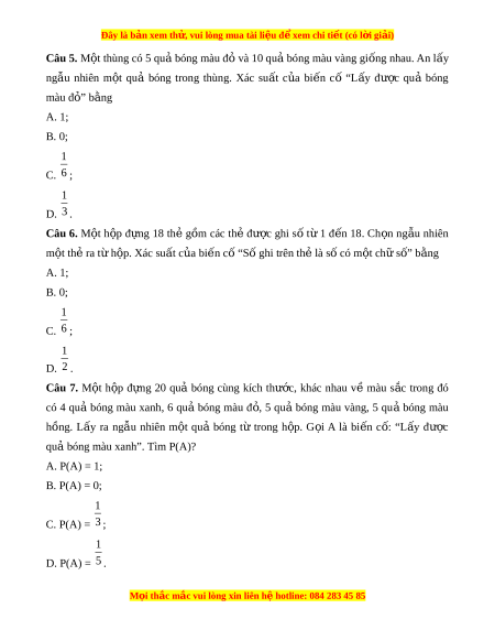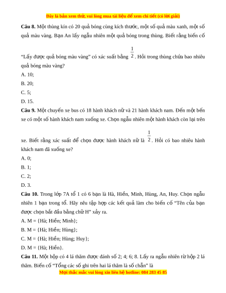 Đây là bản xem th , vu ử i lòng mua tài li u ệ đ xe ể m chi ti t (c ế ó l i ờ gi i ả ) Câu 8. M t ộ thùng kín có 20 qu ả bóng cùng kích thư c, ớ m t ộ s ố qu ả màu xanh, m t ộ số quả màu vàng. B n ạ An l y ấ ng u ẫ nhiên m t