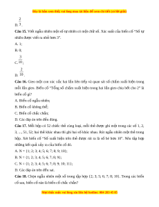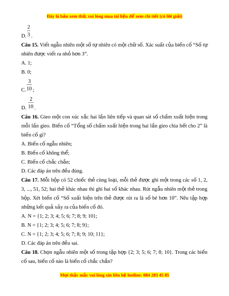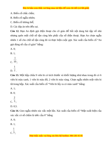 Đây là bản xem th , vu ử i lòng mua tài li u ệ đ xe ể m chi ti t (c ế ó l i ờ gi i ả ) A. Bi n ế cố ch c ắ ch n; ắ B. Bi n c ế ố ng u nhi ẫ ên; C. Bi n c ế ố không th ; ể D. Các đáp án trên đ u s ề ai. Câu 12. B n ạ An đ nh ị g i ọ đi n ệ tho i ạ cho cô giáo để h i ỏ n i ộ dung bài t p ậ về nhà nh ng ư quên m t ấ chữ số t n ậ cùng bên ph i ả c a ủ số đi n ệ tho i ạ . B n ạ An ch n ọ ng u ẫ