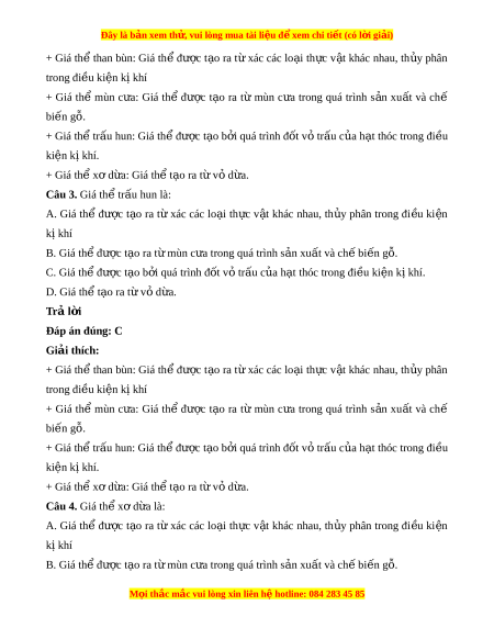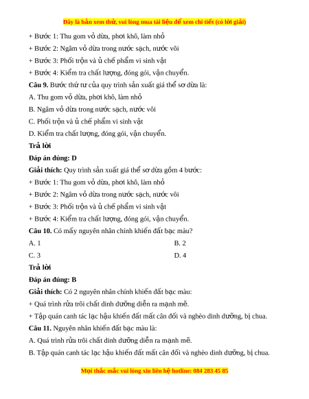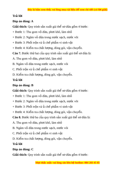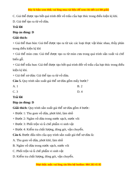 Đây là bản xem th , vu ử i lòng mua tài li u ệ đ xe ể m chi ti t (c ế ó l i ờ gi i ả ) C. Giá th đ ể ư c ợ t o b ạ i ở quá trình đ t ố v t ỏ r u c ấ a h ủ t ạ thóc trong đi u ki ề n k ệ khí ị . D. Giá thể t o r ạ a t v ừ d ỏ a. ừ Trả l i ờ Đáp án đúng: D Giải thích: + Giá th ể than bùn: Giá th ể đư c ợ t o ạ ra t ừ xác các lo i ạ th c ự v t ậ khác nhau, th y ủ phân trong đi u ki ề n k ệ khí ị + Giá thể mùn c a: ư Giá thể đư c ợ t o ạ ra từ mùn c a ư trong quá trình s n ả xu t ấ và chế bi n g ế ỗ. + Giá th t ể r u hun: ấ Giá th đ ể ư c t ợ o ạ b i ở quá trình đ t ố v t ỏ r u c ấ a h ủ t ạ thóc trong đi u ề kiện kị khí. + Giá th x ể ơ d a: ừ Giá th t ể o ạ ra t v ừ d ỏ a. ừ Câu 5. Quy trình s n ả xu t ấ giá th s ể d ơ a ừ g m ồ m y b ấ ư c? ớ A. 1 B. 2 C. 3 D. 4 Trả l i ờ Đáp án đúng: D