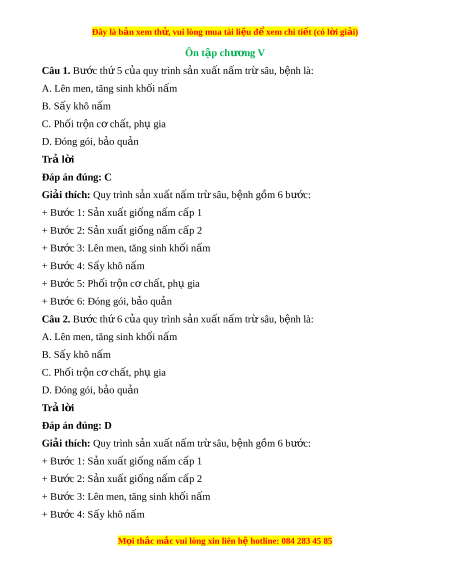 Đây là bản xem th , vu ử i lòng mua tài li u ệ đ xe ể m chi ti t (c ế ó l i ờ gi i ả ) Ôn t p ch ậ ư ng ơ V Câu 1. Bư c t ớ h 5 c ứ a ủ quy trình s n xu ả t ấ n m ấ tr s ừ âu, b nh l ệ à: A. Lên men, tăng sinh kh i ố n m ấ B. S y khô n ấ m ấ C. Ph i ố tr n c ộ ch ơ t ấ , ph gi ụ a D. Đóng gói, b o ả qu n ả Trả l i ờ Đáp án đúng: C
