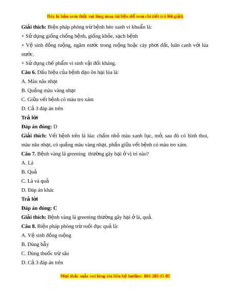 Câu 6. Dấu hiệu c a b ủ ệnh đ o ạ ôn h i ạ lúa là: A. Màu nâu nh t ạ B. Qu ng m ầ àu vàng nh t ạ C. Gi a v ữ t ế b nh có m ệ àu tro xám D. C 3 đáp án ả trên Trả l i ờ Đáp án đúng: D Giải thích: V t ế b nh ệ trên lá lúa: ch m ấ nhỏ màu xanh l c, ụ m , ở sau đó có hình thoi, màu nâu nh t ạ , có qu ng m ầ àu vàng nh t ạ , ph n gi ầ a ữ v t ế b nh có ệ màu tro xám.