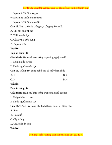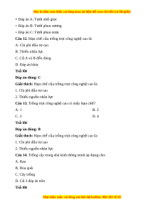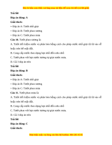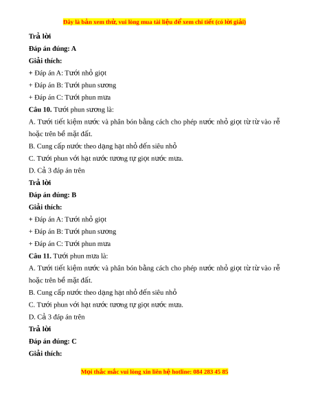 Đây là bản xem th , vu ử i lòng mua tài li u ệ đ xe ể m chi ti t (c ế ó l i ờ gi i ả ) Trả l i ờ Đáp án đúng: A Giải thích: + Đáp án A: Tư i ớ nhỏ gi t ọ + Đáp án B: Tư i ớ phun sư ng ơ + Đáp án C: Tư i ớ phun m a ư Câu 10. Tư i ớ phun sư ng l ơ à: A. Tư i ớ ti t ế ki m ệ nư c ớ và phân bón b ng ằ cách cho phép nư c ớ nh ỏ gi t ọ t ừ t ừ vào rễ ho c ặ trên b m ề t ặ đ t ấ . B. Cung c p n ấ ư c ớ theo d ng h ạ t ạ nh đ ỏ n s ế iêu nhỏ C. Tư i ớ phun v i ớ h t ạ nư c t ớ ư ng ơ t gi ự t ọ nư c m ớ a. ư D. C 3 đáp án ả trên Trả l i ờ Đáp án đúng: B Giải thích: + Đáp án A: Tư i ớ nhỏ gi t ọ + Đáp án B: Tư i ớ phun sư ng ơ + Đáp án C: Tư i ớ phun m a ư Câu 11. Tư i ớ phun m a l ư à: A. Tư i ớ ti t ế ki m ệ nư c ớ và phân bón b ng ằ cách cho phép nư c ớ nh ỏ gi t ọ t ừ t ừ vào rễ ho c ặ trên b m ề t ặ đ t ấ . B. Cung c p n ấ ư c ớ theo d ng h ạ t ạ nh đ ỏ n s ế iêu nhỏ C. Tư i ớ phun v i ớ h t ạ nư c t ớ ư ng ơ t gi ự t ọ nư c m ớ a. ư D. C 3 đáp án ả trên Trả l i ờ Đáp án đúng: C Giải thích: M i