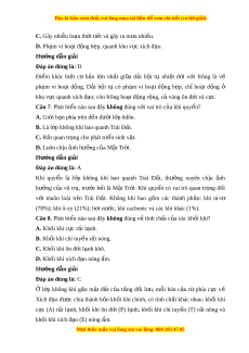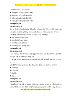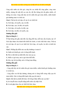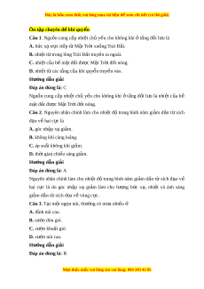 ộ độ cao nào đó, độ m ẩ không khí đã gi m ả nhi u, ề sẽ không còn m a. ư Cùng m t ộ dãy núi thì sư n ờ đón gió m a ư nhi u, ề sư n ờ khu t ấ gió thư ng ờ m a í ư t và khô ráo. Câu 4. Th t ứ ự t xí ừ ch đ o v ạ c ề c ự là các khối khí A. Xích đ o, ạ chí tuy n, c ế c, ự ôn đ i ớ . B. Xích đ o, c ạ c, ự ôn đ i ớ , chí tuy n. ế C. Xích đ o, ạ chí tuy n, ôn đ ế i ớ , c c. ự D. Xích đ o, ạ ôn đ i ớ , chí tuy n, c ế c. ự Hư ng d ớ ẫn gi i ả Đáp án đúng là: C Ở l p ớ không khí g n ầ m t ặ đ t ấ c a ủ t ng ầ đ i ố l u, ư m i ỗ bán c u ầ từ phía c c ự về Xích đ o ạ đư c ợ chia thành b n ố kh i