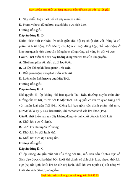Đây là bản xem th , vu ử i lòng mua tài li u ệ đ xe ể m chi ti t ế (có l i ờ gi i ả ) C. Gây nhi u l ễ o n ạ th i ờ ti t ế và gây ra m a ư nhi u. ề D. Ph m ạ vi ho t ạ đ ng ộ h p, quanh ẹ khu v c xí ự ch đ o. ạ Hư ng ớ d n gi ẫ i ả Đáp án đúng là: D Đi m ể khác bi t ệ cơ b n ả l n ớ nh t ấ gi a ữ d i ả h i ộ tụ nhi t ệ đ i ớ v i ớ frông là về ph m ạ vi ho t ạ đ ng. ộ D i ả h i ộ tụ có ph m ạ vi ho t ạ đ ng ộ h p, ẹ chỉ ho t ạ đ ng ộ ở khu v c quanh xí ự ch đ o; ạ còn frông ho t ạ đ ng r ộ ng, c ộ vùng ôn đ ả i ớ và c c. ự