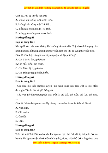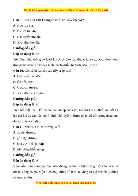 ấ có hai đai khí áp cao c c, ự hai đai khí áp th p ấ ôn đ i ớ và hai đai khí áp cao c n ậ nhi t ệ đ i ớ (chí tuy n) ế , đư c ợ phân b ố đ i ố x ng ứ nhau qua đai áp th p xí ấ ch đ o. ạ Câu 11. N i ơ có ít m a t ư hư ng l ờ à ở A. xa đ i ạ dư ng. ơ B. gần đ i ạ dư ng. ơ C. khu v c ự khí áp th p. ấ