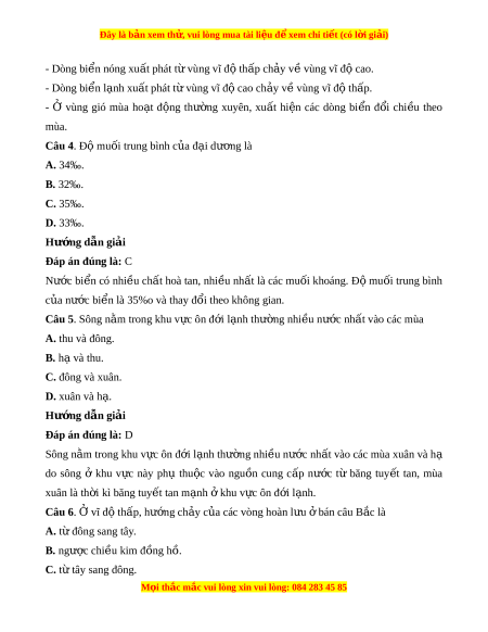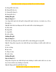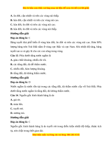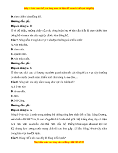 Câu 4. Độ muối trung bình c a đ ủ i ạ dư ng ơ là A. 34‰. B. 32‰. C. 35‰. D. 33‰. Hư ng d ớ ẫn gi i ả Đáp án đúng là: C Nư c ớ bi n ể có nhi u ề ch t ấ hoà tan, nhi u ề nh t ấ là các mu i ố khoáng. Đ ộ mu i ố trung bình c a ủ nư c bi ớ n l ể à 35%o và thay đ i ổ theo không gian. Câu 5. Sông n m ằ trong khu v c ôn đ ự i ớ l nh t ạ hư ng nhi ờ u n ề ư c ớ nh t ấ vào các mùa A. thu và đông. B. h và t ạ hu. C. đông và xuân. D. xuân và h . ạ Hư ng d ớ ẫn gi i ả Đáp án đúng là: D Sông n m ằ trong khu v c ôn đ ự i ớ l nh t ạ hư ng nhi ờ u n ề ư c ớ nh t