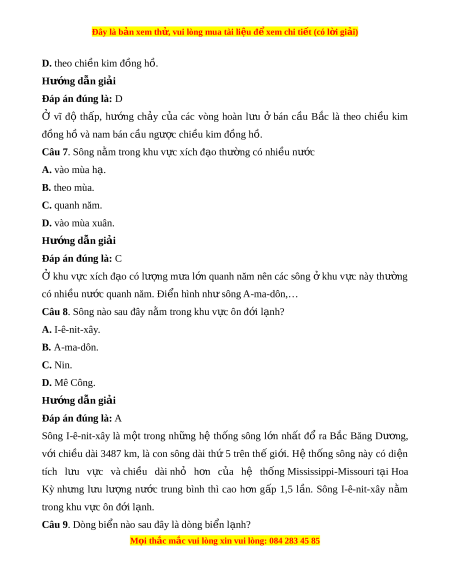 Câu 8. Sông nào sau đây n m ằ trong khu v c ôn đ ự i ớ l nh? ạ A. I-ê-nit-xây. B. A-ma-dôn. C. Nin. D. Mê Công. Hư ng d ớ ẫn gi i ả Đáp án đúng là: A Sông I-ê-nit-xây là m t ộ trong nh ng ữ hệ th ng ố sông l n ớ nh t ấ đổ ra B c ắ Băng Dư ng, ơ v i ớ chi u