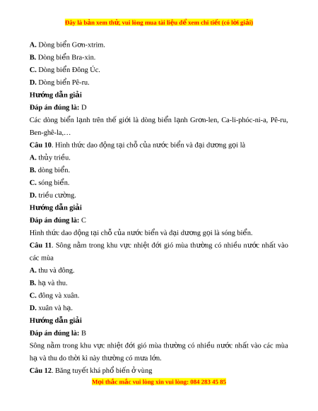 Đây là bản xem th , vu ử i lòng mua tài li u ệ đ xe ể m chi ti t (c ế ó l i ờ gi i ả ) A. Dòng bi n G ể n- ơ xtrim. B. Dòng bi n B ể ra-xin. C. Dòng bi n Đ ể ông Úc. D. Dòng bi n Pê- ể ru. Hư ng d ớ ẫn gi i ả Đáp án đúng là: D Các dòng bi n ể l nh ạ trên thế gi i ớ là dòng bi n ể l nh ạ Gr n
