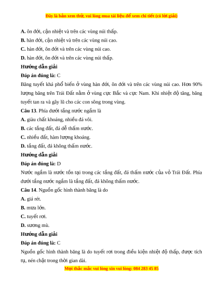 ơ -len, Ca-li-phóc-ni-a, Pê-ru, Ben-ghê-la,… Câu 10. Hình th c ứ dao đ ng t ộ i ạ ch c ỗ a ủ nư c bi ớ n và đ ể i ạ dư ng g ơ i ọ là A. th y t ủ ri u. ề B. dòng bi n. ể C. sóng bi n. ể D. tri u c ề ư ng. ờ Hư ng d ớ ẫn gi i ả Đáp án đúng là: C Hình th c ứ dao đ ng t ộ i ạ ch c ỗ a ủ nư c bi ớ n và đ ể i ạ dư ng g ơ i ọ là sóng bi n. ể Câu 11. Sông n m ằ trong khu v c ự nhi t ệ đ i ớ gió mùa thư ng ờ có nhi u ề nư c ớ nh t ấ vào các mùa A. thu và đông. B. h và t ạ hu. C. đông và xuân. D. xuân và h . ạ Hư ng d ớ ẫn gi i ả Đáp án đúng là: B Sông n m ằ trong khu v c ự nhi t ệ đ i ớ gió mùa thư ng ờ có nhi u ề nư c ớ nh t ấ vào các mùa hạ và thu do th i ờ kì này thư ng có ờ m a l ư n. ớ Câu 12. Băng tuy t ế khá ph bi ổ n ế vùng ở M i ọ thắc m c