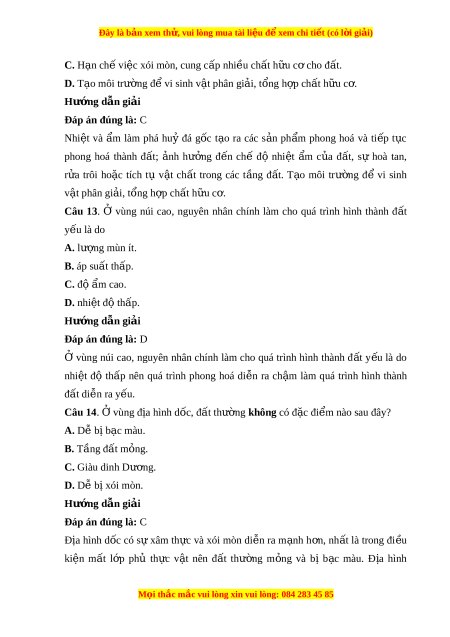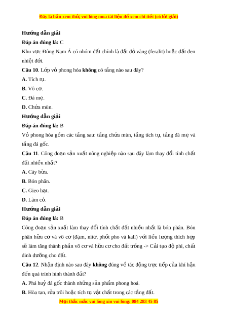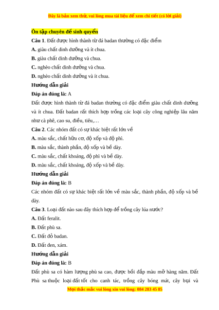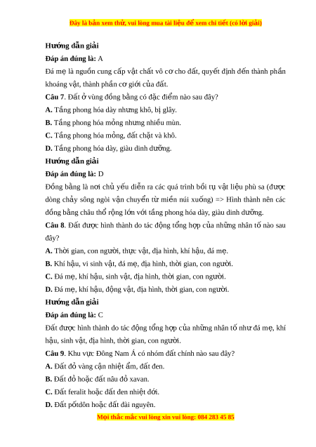 Đây là bản xem th , vu ử i lòng mua tài li u ệ đ xe ể m chi ti t ế (có l i ờ gi i ả ) Hư ng ớ d n gi ẫ i ả Đáp án đúng là: A Đá mẹ là ngu n ồ cung c p ấ v t ậ ch t ấ vô c ơ cho đ t ấ , quy t ế đ nh ị đ n ế thành ph n ầ khoáng v t ậ , thành phần cơ gi i ớ c a đ ủ ất. Câu 7. Đất vùng đ ở ồng b ng ằ có đ c ặ đi m ể nào sau đây?