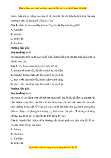 ấ nên quá trình phong hoá di n ễ ra ch m ậ , vỏ phong hoá m ng, ỏ s ự hình thành đ t ấ y u. ế Ở nh ng ữ n i ơ b ng ằ ph ng, ẳ quá trình b i ồ t chi ụ m ế u t ư h , t ế ng đ ầ t ấ dày. Câu 6. Quy t ế đ nh ị thành ph n ầ khoáng v t ậ , thành ph n ầ cơ gi i ớ c a ủ đ t ấ là vai trò c a nhân t ủ ố nào sau đây? A. Đá m . ẹ B. Địa hình. C. Khí h u. ậ D. Sinh v t ậ . M i ọ thắc m c
