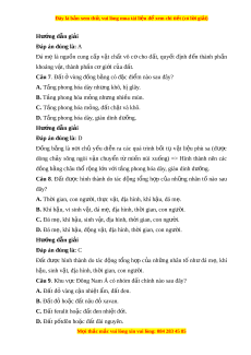 D. Đá mẹ, khí h u, đ ậ ng v ộ t ậ , đ a hì ị nh, th i ờ gian, con ngư i ờ . Hư ng ớ d n gi ẫ i ả Đáp án đúng là: C Đất đư c ợ hình thành do tác đ ng ộ t ng ổ h p ợ c a ủ nh ng ữ nhân t ố nh ư đá m , ẹ khí h u, s ậ inh v t ậ , đ a hì ị nh, th i ờ gian, con ngư i ờ . Câu 9. Khu v c Đ ự ông Nam Á có nhóm đ t ấ chính nào sau đây? A. Đất đ vàng c ỏ n ậ nhi t ệ m ẩ , đ t ấ đen. B. Đất đ ho ỏ c ặ đ t ấ nâu đ xavan. ỏ