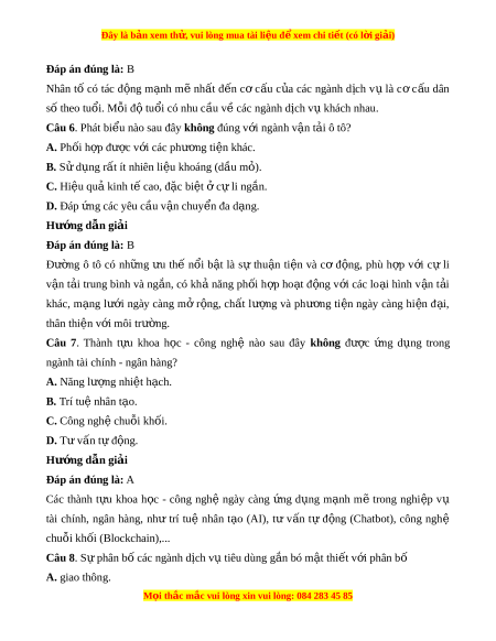 Đây là bản xem th , vu ử i lòng mua tài li u ệ đ xe ể m chi ti t (c ế ó l i ờ gi i ả ) Đáp án đúng là: B Nhân tố có tác đ ng ộ m nh ạ m ẽ nh t ấ đ n ế c ơ c u ấ c a ủ các ngành d ch ị v ụ là c ơ c u ấ dân số theo tuổi. M i ỗ đ t ộ u i ổ có nhu c u v ầ các ề ngành d ch v ị khách nhau. ụ