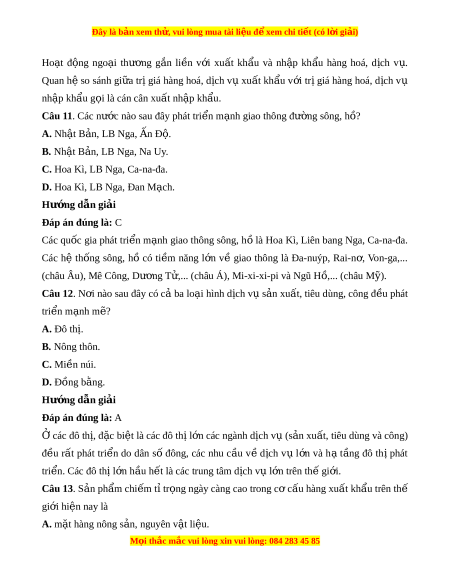 ệ tự nhiên, tuy nhiên, cư c ớ phí v n ậ t i ả đ t ắ , tr ng ọ lư ng ợ v n ậ t i ả th p. ấ Câu 10. Ho t ạ đ ng ngo ộ i ạ thư ng ơ g n l ắ i n v ề i ớ A. các ho t ạ đ ng nh ộ p ậ kh u hàng hoá, d ẩ ch v ị . ụ B. xu t ấ kh u và nh ẩ p ậ kh u hàng hoá, d ẩ ch v ị . ụ C. mua bán và nh p kh ậ u hàng hoá, d ẩ ch v ị . ụ D. các ho t ạ đ ng xu ộ ất kh u hàng hoá, d ẩ ch v ị . ụ Hư ng d ớ ẫn gi i ả Đáp án đúng là: B M i ọ thắc m c