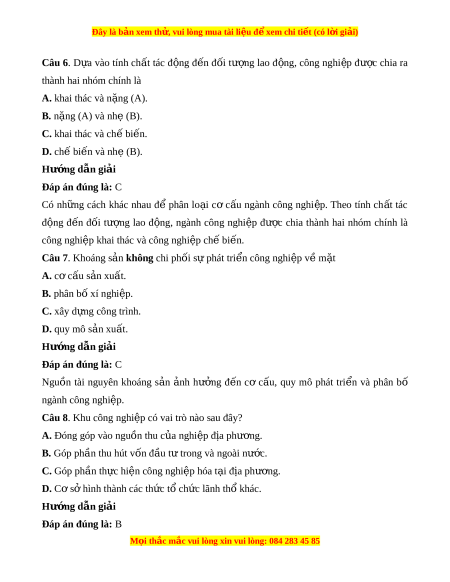 Đây là bản xem th , vu ử i lòng mua tài li u ệ đ xe ể m chi ti t (c ế ó l i ờ gi i ả ) Câu 6. D a ự vào tính ch t ấ tác đ ng ộ đ n ế đ i ố tư ng ợ lao đ ng, ộ công nghi p ệ đư c ợ chia ra thành hai nhóm chính là