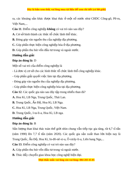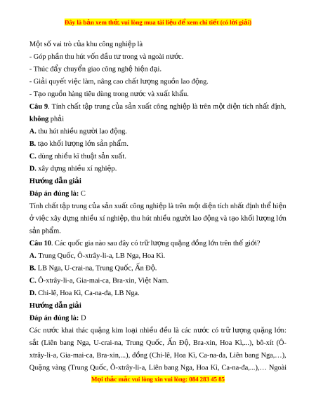ồn hàng tiêu dùng trong nư c và xu ớ t ấ kh u. ẩ Câu 9. Tính ch t ấ t p ậ trung c a ủ s n ả xu t ấ công nghi p ệ là trên m t ộ di n ệ tích nh t ấ đ nh, ị không ph i ả A. thu hút nhi u ng ề ư i ờ lao đ ng. ộ B. t o kh ạ ối lư ng l ợ n s ớ n ph ả m ẩ . C. dùng nhi u kĩ ề thu t ậ s n ả xu t ấ . D. xây d ng ự nhi u xí ề nghi p. ệ Hư ng d ớ ẫn gi i ả Đáp án đúng là: C Tính ch t ấ t p ậ trung c a ủ s n ả xu t ấ công nghi p ệ là trên m t ộ di n ệ tích nh t ấ đ nh ị th ể hi n ệ ở việc xây d ng ự nhi u ề xí nghi p, ệ thu hút nhi u ề ngư i ờ lao đ ng ộ và t o ạ kh i ố lư ng ợ l n ớ s n ph ả ẩm.