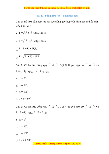 Đây là bản xem th , vu ử i lòng mua tài li u ệ đ xe ể m chi ti t ế (có l i ờ gi i ả ) Bài 13. T ng ổ h p l ợ c – P ự hân tích l c ự Câu 1: Độ l n ớ c a ủ h p ợ l c ự hai l c ự đ ng ồ quy h p ợ v i ớ nhau góc α th a ỏ mãn bi u t ể h c nào? ứ 2 2
