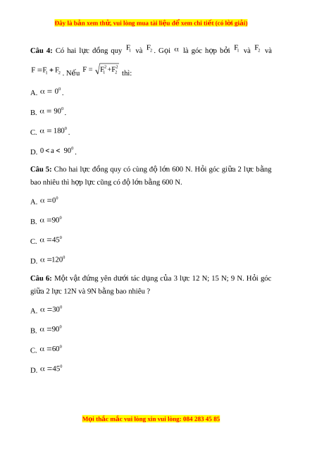 Câu 4: Có hai l c ự đ ng ồ quy F F F F 1 và 2 . G i ọ là góc h p ợ b i ở 1 và 2 và F F 2 2 F F = F +F 1 2 . N u ế 1 2 thì: A. 0 0 . B. 0 90 . C. 0 180 . D. 0 0 a 90 . Câu 5: Cho hai l c ự đ ng ồ quy có cùng đ ộ l n ớ 600 N. H i ỏ góc gi a ữ 2 l c ự b ng ằ bao nhiêu thì h p ợ l c cũng có đ ự l ộ n ớ b ng 600 N ằ . A. 0 0 B. 0 9 0 C. 0 4 5 D. 0 1 20 Câu 6: M t ộ v t ậ đ ng ứ yên dư i ớ tác d ng ụ c a ủ 3 l c ự 12 N; 15 N; 9 N. H i ỏ góc gi a ữ 2 l c 12N ự và 9N b ng ằ bao nhiêu ? A. 0 3 0 B. 0 9 0 C. 0 6 0 D. 0 4 5 M i ọ thắc m c