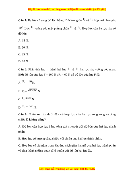 Đây là bản xem th , vu ử i lòng mua tài li u ệ đ xe ể m chi ti t ế (có l i ờ gi i ả ) Câu 7: Ba l c ự có cùng độ l n ớ b ng ằ 10 N trong đó F F 1 và 2 h p ợ v i ớ nhau góc 0 60 . L c ự F F F 3 vuông góc m t ặ ph ng ẳ ch a ứ 1 và 2 . H p ợ l c ự c a ủ ba l c ự này có đ l ộ n. ớ A. 15 N. B. 30 N. C. 25 N. D. 20 N. Câu 8: Phân tích l c ự F thành hai l c ự 1 F và F2 hai l c ự này vuông góc nhau. Bi t ế đ l ộ n ớ c a l ủ c F = 100 N ự ; F1 = 60 N thì đ l ộ n ớ c a l ủ c F ự 2 là: A. F 40 2 N. B. F2 = 13600 N. C. F 80 2 N. D. F 640 2 N. Câu 9: Nh n ậ xet nào dư i ớ đây v ê h p ợ l c ự c a ủ hai l c ự song song và cùng chi u l ê à không đúng? A. Đ ộ l n ớ c a ủ h p ợ l c ự b ng ằ t ng ô giá tr ituy t ê đ i ô đ ộ l n ớ c a ủ hai l c ự thành phân. B. H p ợ l c có h ự ư ng cùng ớ chi u v ê i ớ chi u c ê a ủ hai l c t ự hành ph n. â C. H p ợ l c ự có giá n m ằ trong kho ng a cách gi a ữ hai giá c a ủ hai l c ự thành ph n â và chia thành nh ng đo ữ n a t l i t ê hu n ậ v i ớ đ l ộ n hai ớ l c ự y â . M i