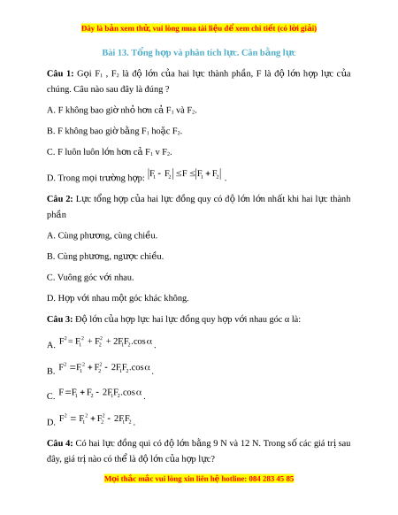 Đây là bản xem th , vu ử i lòng mua tài li u ệ đ xe ể m chi ti t (c ế ó l i ờ gi i ả ) Bài 13. T ng h ổ p và phân t ợ ích l c. C ự ân b ng l ằ c ự Câu 1: G i ọ F1 , F2 là độ l n ớ c a ủ hai l c ự thành ph n, ầ F là độ l n ớ h p ợ l c ự c a ủ