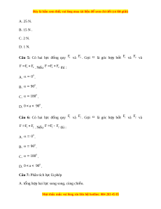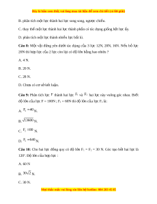ự này vuông góc nhau. Bi t ế độ l n c ớ a l ủ c F = 100N ự ; F1 = 60N thì đ l ộ n c ớ a ủ l c F ự 2 là: A. F 4 0 2 N. B. 13600 N. C. F 8 0 2 N. D. F 6 40 2 N. Câu 10: Cho hai l c ự đ ng ồ quy có độ l n ớ F1 = F2 = 30 N. Góc t o ạ b i ở hai l c ự là 120o. Đ l ộ n c ớ a ủ h p l ợ c : ự A. 60 N B. 30 2 N. C. 30 N. M i