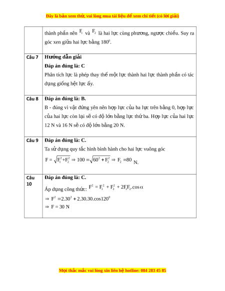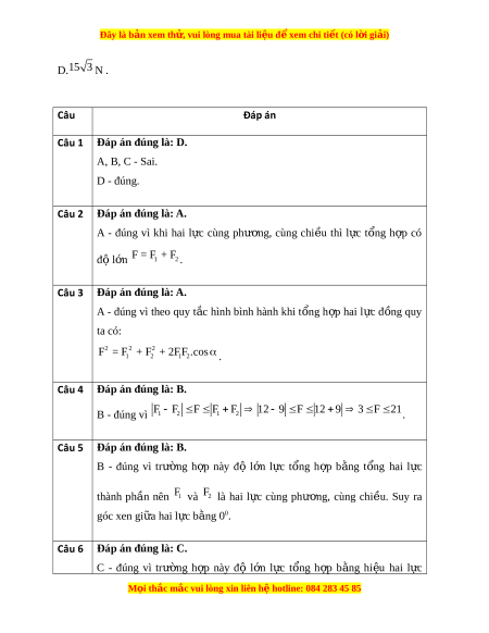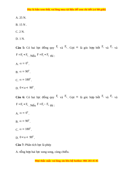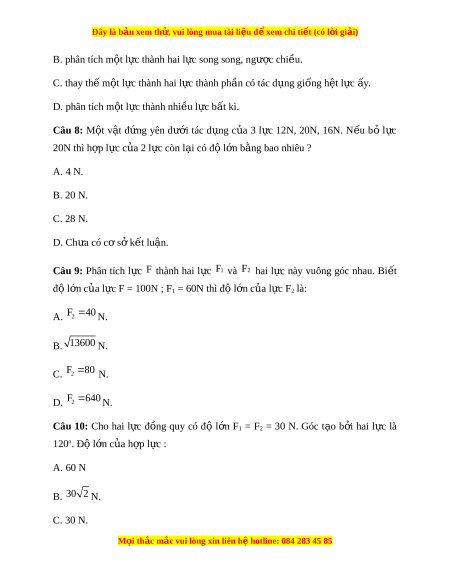 Đây là bản xem th , vu ử i lòng mua tài li u ệ đ xe ể m chi ti t (c ế ó l i ờ gi i ả ) B. phân tích m t ộ l c t ự hành hai l c ự song song, ngư c chi ợ u. ề C. thay th m ế t ộ l c t ự hành hai l c ự thành ph n có ầ tác d ng gi ụ ng h ố t ệ l c ự y ấ . D. phân tích m t ộ l c t ự hành nhi u l ề c b ự t ấ kì. Câu 8: M t ộ v t ậ đ ng ứ yên dư i ớ tác d ng ụ c a ủ 3 l c ự 12N, 20N, 16N. N u ế b ỏ l c ự 20N thì h p l ợ c ự c a 2 l ủ c còn ự l i ạ có đ l ộ n ớ b ng bao nhi ằ êu ? A. 4 N. B. 20 N. C. 28 N. D. Chưa có cơ s k ở t ế lu n. ậ Câu 9: Phân tích l c ự F thành hai l c ự 1 F và F2 hai l c