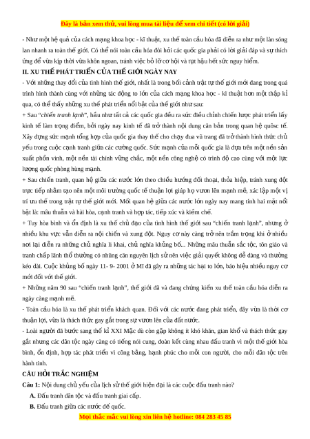 ặ không ít khó khăn, gian kh ổ và thách th c ứ gay gắt nh ng ư các dân t c ộ ngày càng có ti ng ế nói cung, đoàn k t ế cùng nhau đ u ấ tranh vì m t ộ th ế gi i ớ hòa bình, n ổ đ nh, ị h p ợ tác phát tri n ể vì công b ng, ằ h nh ạ phúc cho m i ỗ con ngư i ờ , cho m i ỗ dân t c ộ trên hành tinh. CÂU H I Ỏ TR C Ắ NGHI M Ệ Câu 1: N i ộ dung ch y ủ u c ế a ủ l c ị h s t ử h gi ế i ớ hi n đ ệ i ạ là các cu c ộ đ u t ấ ranh nào? A. Đ u t ấ ranh dân t c