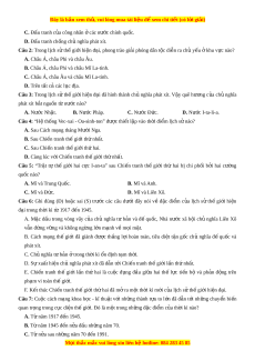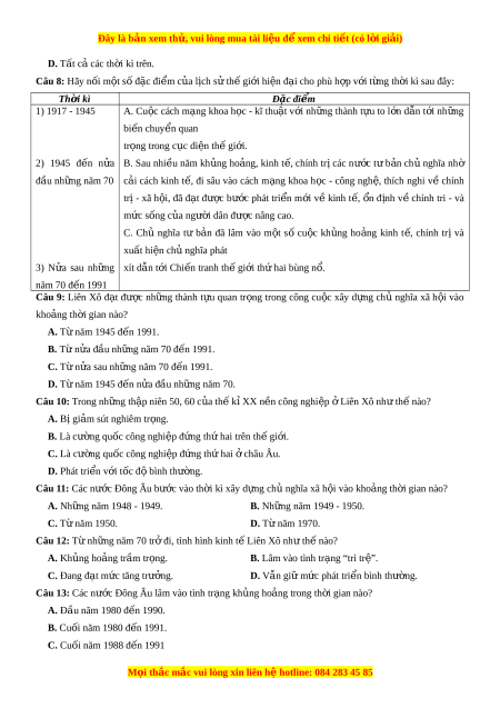 ệ đ xe ể m chi ti t ế (có l i ờ gi i ả ) D. Tất cả các th i ờ kì trên. Câu 8: Hãy n i ố m t ộ s đ ố c ặ đi m ể c a ủ l c ị h s t ử h gi ế i ớ hi n đ ệ i ạ cho phù h p v ợ i ớ t ng ừ th i ờ kì sau đây: Th i ờ kì Đặc đi m ể 1) 1917 - 1945 A. Cu c ộ cách m ng ạ khoa h c ọ - kĩ thu t ậ v i ớ nh ng ữ thành t u ự to l n ớ d n ẫ t i ớ nh ng ữ biến chuyển quan tr ng t ọ rong c c ụ di n ệ th gi ế i ớ . 2) 1945 đ n ế n a ử B. Sau nhi u ề năm kh ng ủ ho ng, ả kinh t , ế chính tr ịcác nư c ớ t ư b n ả ch ủ nghĩa nhờ đầu nh ng nă ữ m 70 cải cách kinh t , ế đi sâu vào cách m ng ạ khoa h c ọ - công ngh , ệ thích nghi v ề chính trị - xã h i ộ , đã đ t ạ đư c ợ bư c ớ phát tri n ể m i ớ v ề kinh t , ế n ổ đ nh ị v ề chính tri - và m c ứ s ng c ố a ủ ngư i ờ dân đư c ợ nâng cao. C. Chủ nghĩa tư b n ả đã lâm vào m t ộ số cu c ộ kh ng ủ ho ng ả kinh t , ế chính trị và xuất hi n c ệ h nghĩ ủ a phát 3) N a ử sau nh ng ữ xít dẫn t i ớ Chi n t ế ranh th gi ế i ớ th ha ứ i bùng n . ổ năm 70 đ n 1991 ế Câu 9: Liên Xô đ t ạ đư c ợ nh ng ữ thành t u ự quan tr ng ọ trong công cu c ộ xây d ng ự ch ủ nghĩa xã h i ộ vào khoảng th i ờ gian nào?