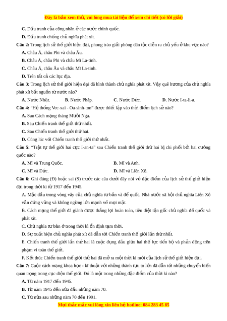 ệ đ xe ể m chi ti t ế (có l i ờ gi i ả ) C. Đ u t ấ ranh c a ủ công nhân ở các nư c ớ chính qu c ố . D. Đ u t ấ ranh ch ng ố ch nghĩ ủ a phát xít. Câu 2: Trong l c ị h s t ử h gi ế i ớ hi n ệ đ i ạ , phong trào gi i ả phóng dân t c ộ di n ễ ra ch y ủ u ế khu v ở c ự nào?