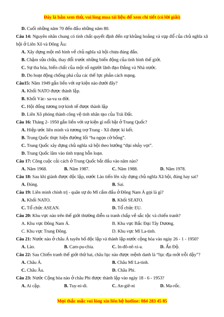 A. Mặc dầu trong vòng vây c a ủ chủ nghĩa tư b n ả và đế qu c ố , Nhà nư c ớ xã h i ộ ch ủ nghĩa Liên Xô vẫn đ ng ứ v ng và ữ không ng ng l ừ n ớ mạnh v m ề i ọ mặt. B. Cách m ng ạ thế gi i ớ đã giành đư c ợ th ng ắ l i ợ hoàn toàn, tiêu di t ệ t n ậ g c ố ch ủ nghĩa đ ế qu c ố và phát xít. C. Ch nghĩ ủ a t b ư ản t ở rong th i ờ kì n đ ổ nh t ị m ạ th i ờ . D. S xu ự ất hi n ệ ch nghĩ ủ a phát xít đã dẫn t i ớ Chi n t ế ranh thế gi i ớ lần thứ nh t ấ . E. Chi n ế tranh thế gi i ớ l n ầ thứ hai là cu c ộ đ ng ụ đ u ầ gi a ữ hai thế l c ự ti n ế bộ và ph n ả đ ng ộ trên phạm vi toàn th gi ế i ớ . F. Kết thúc Chi n ế tranh th gi ế i ớ thứ hai đã m ra ở m t ộ th i ờ kì m i ớ c a ủ l c ị h s t ử h gi ế i ớ hi n ệ đ i ạ . Câu 7: Cu c ộ cách m ng ạ khoa h c ọ - kĩ thu t ậ v i ớ nh ng ữ thành t u ự to l n ớ đã d n ẫ t i ớ nh ng ữ chuy n ể bi n ế quan tr ng ọ trong c c ụ di n t ệ h gi ế i ớ . Đó là m t ộ trong nh ng đ ữ c ặ đi m ể c a ủ th i ờ kì nào?