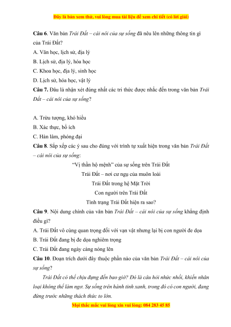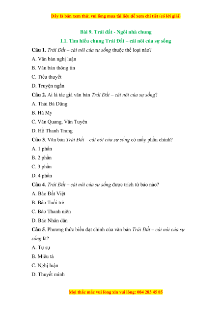 Câu 1. Trái Đất – cái nôi của sự sống thuộc thể loại nào? A. Văn bản nghị luận B. Văn bản thông tin C. Tiểu thuyết D. Truyện ngắn