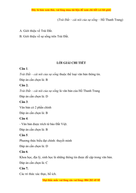 Câu 5. Phương thức biểu đạt chính của văn bản Trái Đất – cái nôi của sự sống là? A. Tự sự B. Miêu tả C. Nghị luận D. Thuyết minh