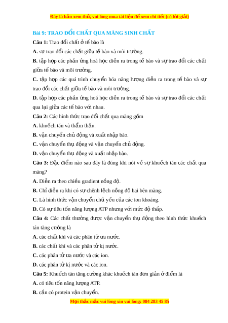 Đây là bản xem th , vu ử i lòng mua tài li u ệ đ xe ể m chi ti t ế (có l i ờ gi i ả ) Bài 9: TRAO Đ I Ổ CH T Ấ QUA MÀNG SINH CH T Ấ