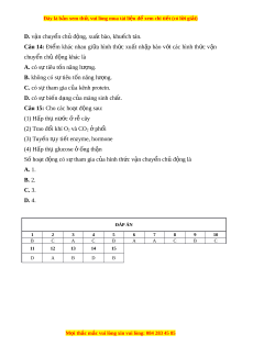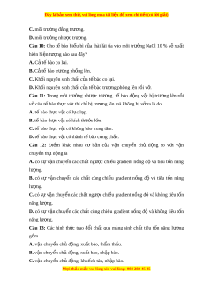 Câu 11: Trong môi trư ng ờ như c ợ trư ng, ơ t ế bào đ ng ô v t ậ b itrư ng ơ lên r i ồ v còn t ơ bào t ế h c ự v t ậ thi ch b i t i rư ng ơ lên mà không b v i r ơ a là do A. t bào t ế h c v ự t ậ co l c l ụ p. a B. t bào ế th c ự v t ậ co kích thư c ơ l n. ơ C. t bào t ế h c v ự t ậ co không bào trung tâm. D. t bào t ế h c v ự t ậ co thành t bào c ế ng ứ ch c. ă Câu 12: Đi m ê khác nhau cơ b n ả c a u v n ậ chuy n ê chu đ ng ô so v i ơ v n ậ chuy n t ê h đ ụ ng l ô à A. co sự v n ậ chuy n ê các ch t ấ ngư c ợ chi u ê gradient n ng ồ đ ô và tiêu t n ô năng lư ng. ợ B. co sự v n ậ chuy n ê các ch t ấ cùng chi u ê gradient n ng ồ đô và tiêu t n ô năng lư ng. ợ C. co sự v n chuy ậ n các ê chất ngư c chi ợ u ê gradient n ng đ ồ và không t ô iêu t n ô năng lư ng. ợ D. co sự v n ậ chuy n ê các ch t ấ cùng chi u ê gradient n ng ồ đô và không tiêu t n ô năng lư ng. ợ Câu 13: Các hinh th c ứ trao đ i ổ ch t ấ qua màng sinh ch t ấ tiêu t n ô năng lư ng ợ gồm A. v n chuy ậ n ê ch đ u ng, xu ô t ấ bào, th m ẩ th u. ấ B. v n ậ chuy n ch ê đ u ng, ô xu t ấ bào, nh p bào. ậ C. v n chuy ậ n ê ch đ u ng, khu ô ch ế tán, nh p bào. ậ M i