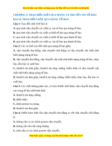 Câu 1: Trao đổi chất t ở bào ế là A. quá trình v n chuy ậ n ể các ch t ấ ra, vào t bào qua m ế àng tế bào. B. quá trình v n ậ chuy n các ể ch t ấ ra kh i o tế bào qua màng t bào. ế C. quá trình v n chuy ậ n ể các ch t ấ ra kh i o t bào qua t ế hành tế bào. D. quá trình v n chuy ậ n ể các ch t ấ ra, vào t bào qua t ế hành tế bào. Câu 2: Các c ch ơ t ế rao đ i ổ ch t ấ qua màng t bào g ế m ô A. v n ậ chuy n ể th u đ ng, ô v n ậ chuy n ể ch u đ ng ô và v n ậ chuy n ể v t ậ ch t ấ nhơ bi n d ế ng a màng t bào. ế B. v n ậ chuy n ể th u đ ng, ô v n ậ chuy n ể v t ậ ch t ấ nh ơ bi n ế d ng a màng t ế bào, th c ư